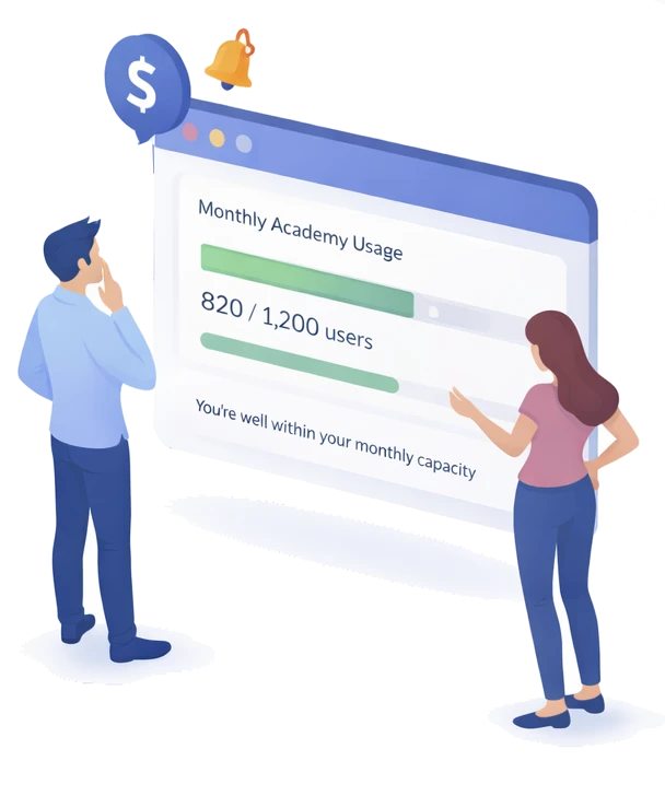 Each month, your academy receives a clear usage capacity based on the current number of active users, including additional room for natural growth – so you can expand with confidence.